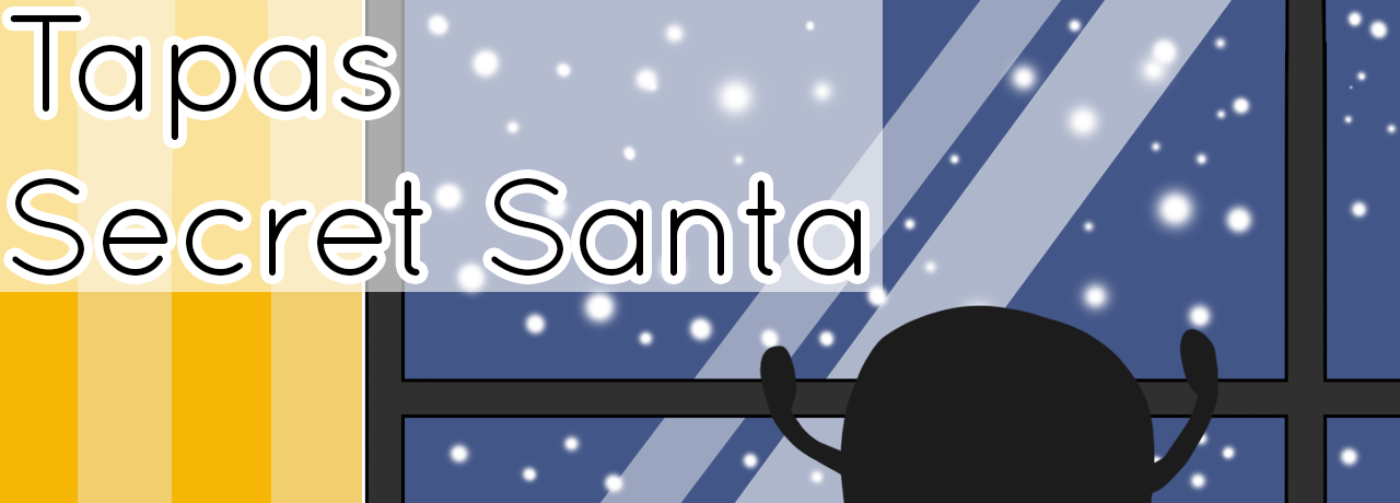 From husband:Overall design is good. Personally I would have the white box go across the banner, and have "Tapas Secret Santa" all on one line. Reduce the height of the box to match this and that should give the image part a little more breathing room.