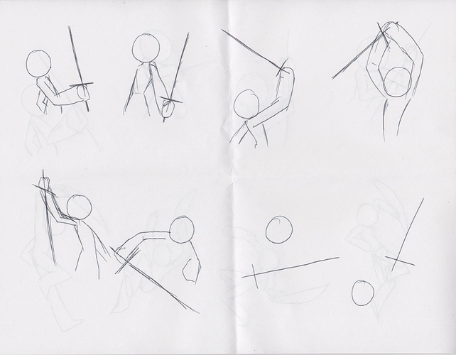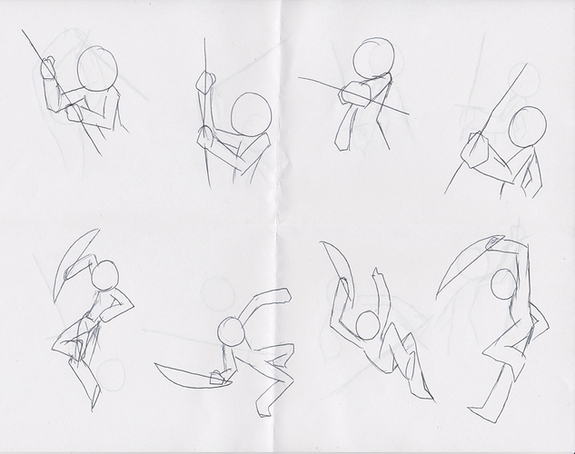 Coincidentally (or maybe because I saw this topic and wondered how to improve my own skills before I left for the day), I came up with an 'idea generation exercise' that would prompt me to create action poses with different weapons, and I started using it today at work. Take a look: