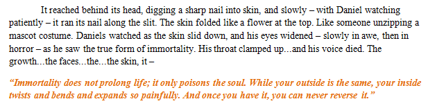 There is a slight hint of what Daniels sees -- faces, skin growth -- but the focus was on his perspective. His body froze at the sight, and I never go into details on what this "immortality" truly looks like. Rather, that is up to the reader to create. But in the end, they do know that what Daniels saw caused him to paralyze in fear.