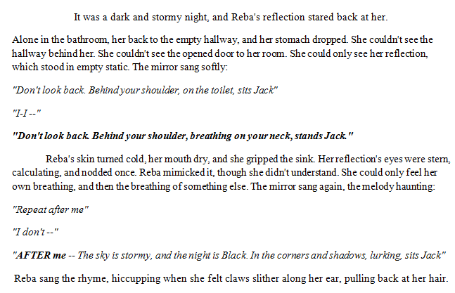 Sometimes, it helps to use repetition to emphasize the importance of key phrases, actions, or dialogue. For myself, I use it a lot for moments when I incorporate rhyming and singing into my horror, as noted down belong:
