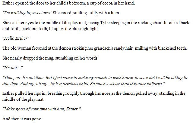 The demon fits right inside the child's room, even though we know and Ester knows it shouldn't be there. It lingers for about a few minutes at best in the story, but during those minutes, you understand that A) what it looks like and B) Ester knows it will take her grandson. It's subtle, quick, but it gets the message across. And just like that, it's gone.