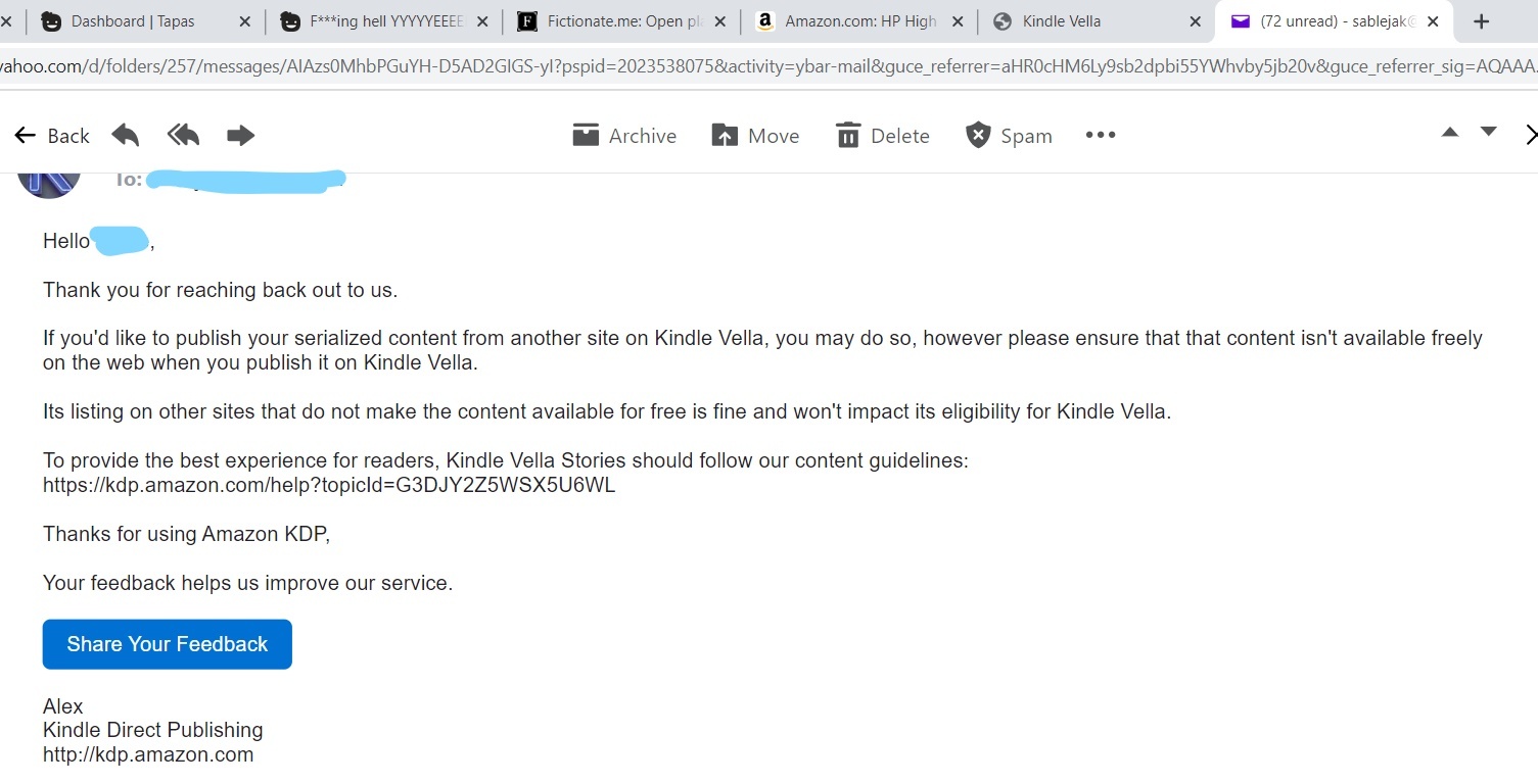 As authors we call our work "books." Whether they are paper in our hands or digital. So when queries have been made the keywords that got the attention of the kindle people were not said. Once, in my communications I realized that they were talking about published books... books...not serialized webnovels. I stressed the fact that the story (I did not say book) that I had was a serialized webnovel that was uploaded episode by episode and then also provided a link to it here at Tapas... things changed almost immediately. I believe they did go in and check my link to Tapas as my story suddenly had some hits and hadn't had any for a couple days.