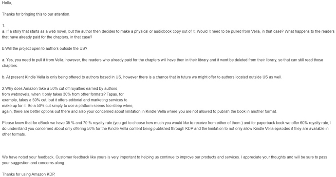 No problem, I'm glad to clarify! They also say that, if you publish with Vella first, you can't then take the novel and make a hardcopy or audiobook for people who prefer those formats and won't read online or who want a physical copy for, say, collection reasons. It's not uncommon for webnovel authors to offer PDF or ebook versions of their books to their subscribers, either, and this option is completely blocked with Vella. So, while they say, we keep our rights... We can't really do anything with them, can we? We're locking ourselves into one type of audience only. Not to mention, you can't re-release in any language. So, bye bye, translation rights. You can pull the novel from Vella to do all of this, but what happens to the readers that have already paid for the chapters, then? This isn't specified, anywhere. Worst case scenario, they end up with no book, angry and will never buy anything from you, again.