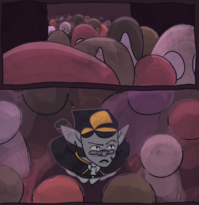 If any of you guys want to have your oc show up in the background somewhere, please do slide me a reference picture and the link to your comic or your work, so I can link it at the bottom of the page your character will appear in. I'll probably be more inclined to less-detailed characters simply because they are easy to draw and I'm lazy haha. I'll probably also be picking characters based on the color palate of the page, which usually includes purple, black, and orange/yellow, but it does definitely vary.