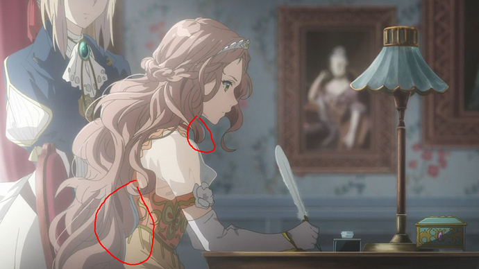 this. in this scene, it's the blues in her hair. in other scenes they have a sort of peach color they use for shading. it irked me bc i don't think there's actually any reason for those shades to be there. but idk color theory so maybe i'm just talking out my ass.