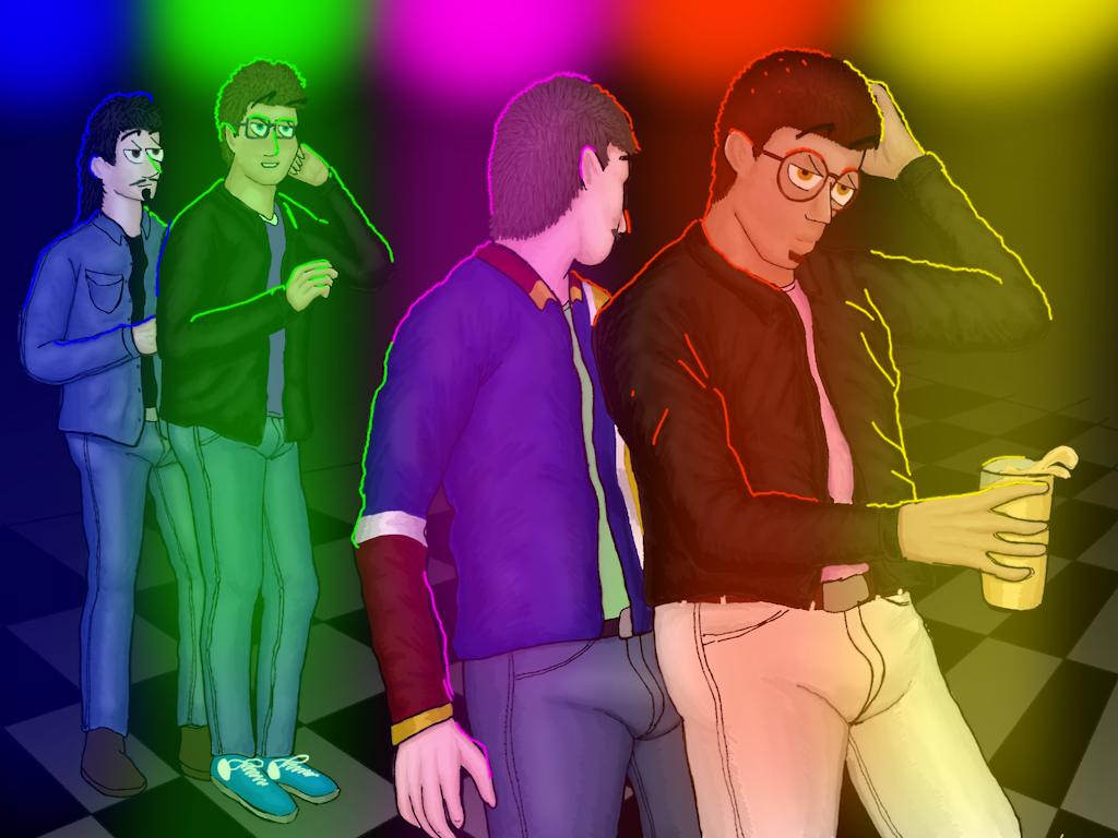 An explanation of what is going on here: I (under green light), along with my friend Johnny (under blue light) am watching my boyfriend Troy (under purple light) dance with a guy that I had briefly dated, Darryl (under red/yellow lights), who also happens to be Johnny's boyfriend. Yeah, it was a weird night.