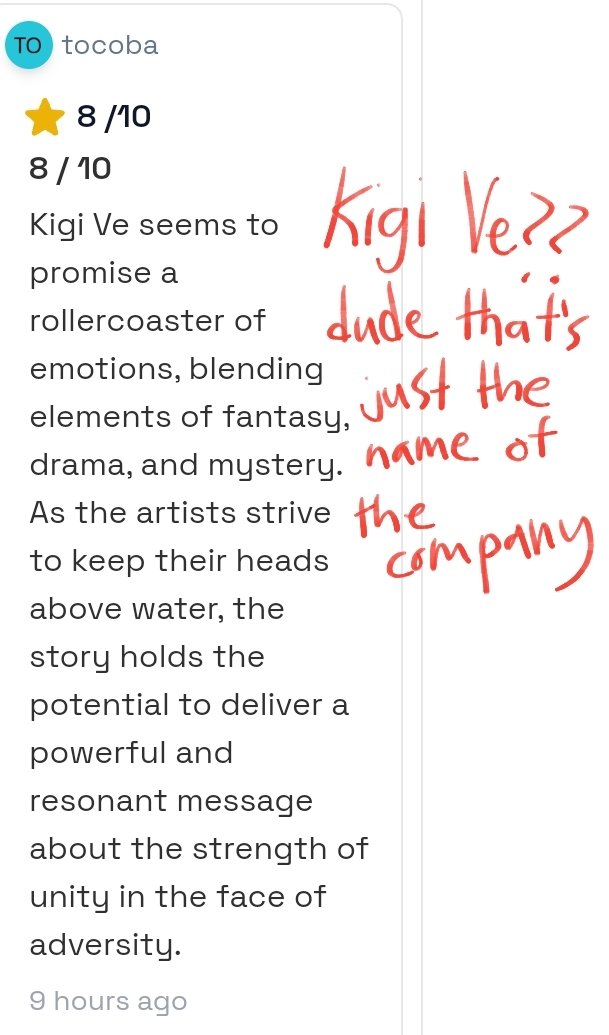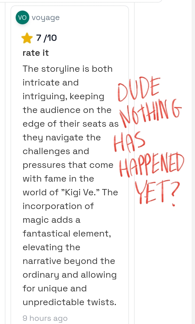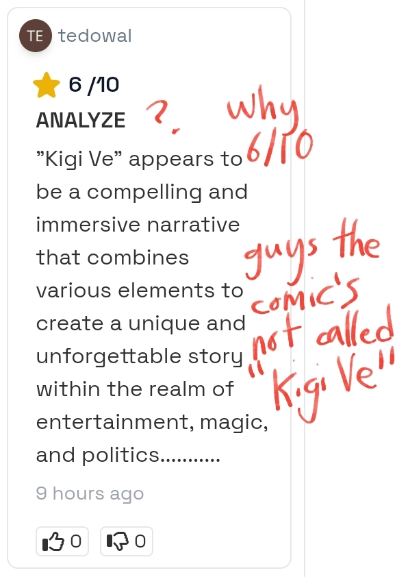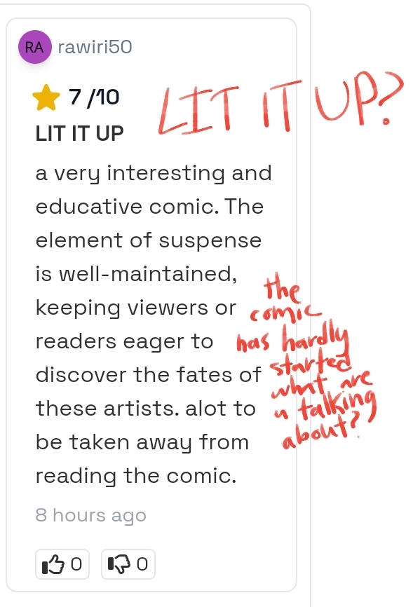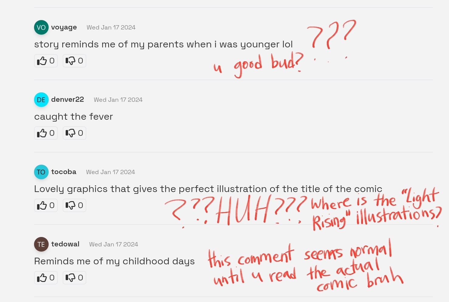 I've only posted 4 episodes (up to page 11) of my comic, and that's when I started getting some odd comments and reviews. I've messed with Chat GPT before, I immediately knew that they were all AI generated (except for one that seemed legit). The thing is, why? If you're gonna be a bot spamming on a random site, why just leave inaccurate but positive comment on someone's page? Unless.... this is from Blocktoons trying to make their site look more active. I don't know if this is for sure the case, but what other reason could it be?