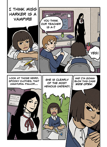 But with other comics and illos, I might try very different approaches. For example, going really subdued and low saturation on all the colours gives a "gloomy" and "down to earth" vibe: