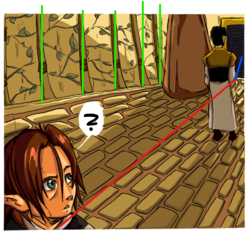 And in the final panel I mentioned, the vanishing point changes entirely. On the cobble ground it goes one way, then breaks to go in a different direction for the hallway. And then as I mentioned before, Lines are not parallel where they should. Now, to give the benefit of the doubt, the goal may have been to have the pillars in the back come off as more organic and tree like. And that's fine, but they should still be consistent.