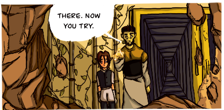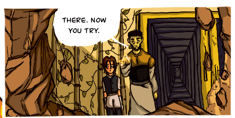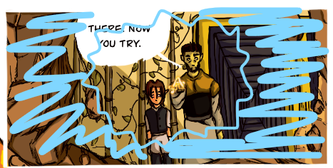 This group of panels confuses me. In the first one it looks like they're standing right in front of the doors, but a page later, they're both far enough away that the mentor has a room's length amount of space before he reach the doors! Did they teleport? Were they always that far way from the doors? And where did that rock that's right next to the doors com from? It wasn't there before. Continuity and spatial understanding. I feel like you need to work on those. Keep things consistent panel to panel so that readers aren't confused as to where everyone and everything is, especially since this is going to be an action comic. It's very hard I would know, but it's very important. If it helps, you can have a map or overhead layout of a space before you draw a scene in it. Consider doing that.