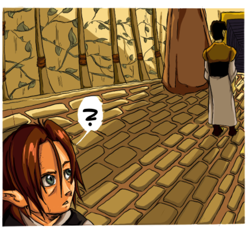 But the background values are all similar in color and value, and the little bit of light green isn't enough to contrast the rest of the brown and gold. The background look flat. And because there aren't many panels showing the full body of the characters in the space (likely due to the small amount of pages, let's be real) with good perspective, characters aren't really grounded. They're not out there floating, but they feel detached from the environment.