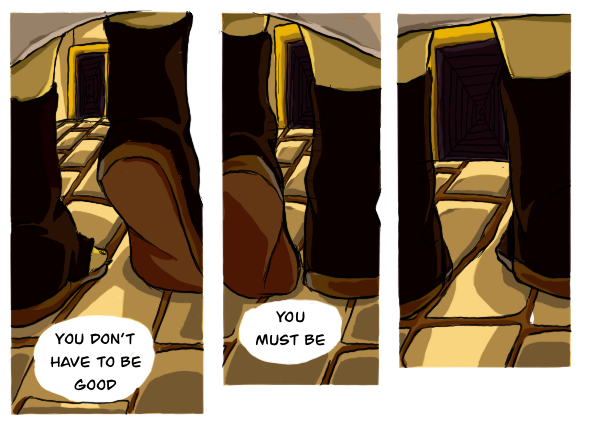 This panel's perspective if off because the hallway that leads behind them looks off. It implies that the horizon line is higher than where than character's feet are. Now that can work, assuming that the hallway goes up a hill. But in that case something else as to give. If the hallway is leading up, then we shouldn't be able to see the ceiling of the hallway. Also, that hallway implies that the vanishing point is off to the side, but we're looking through the rock and at the characters from the front, with no perspective added to them at all.