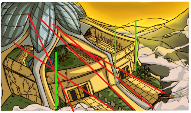 In this panel, lines don't end at the same vanishing point, lines that should be parallel aren't, and there's not a clear horizon line. All and all, it looks like this, I'm assuming, temple is sliding of the hill it's built on. And over all the whole building looks flat.
