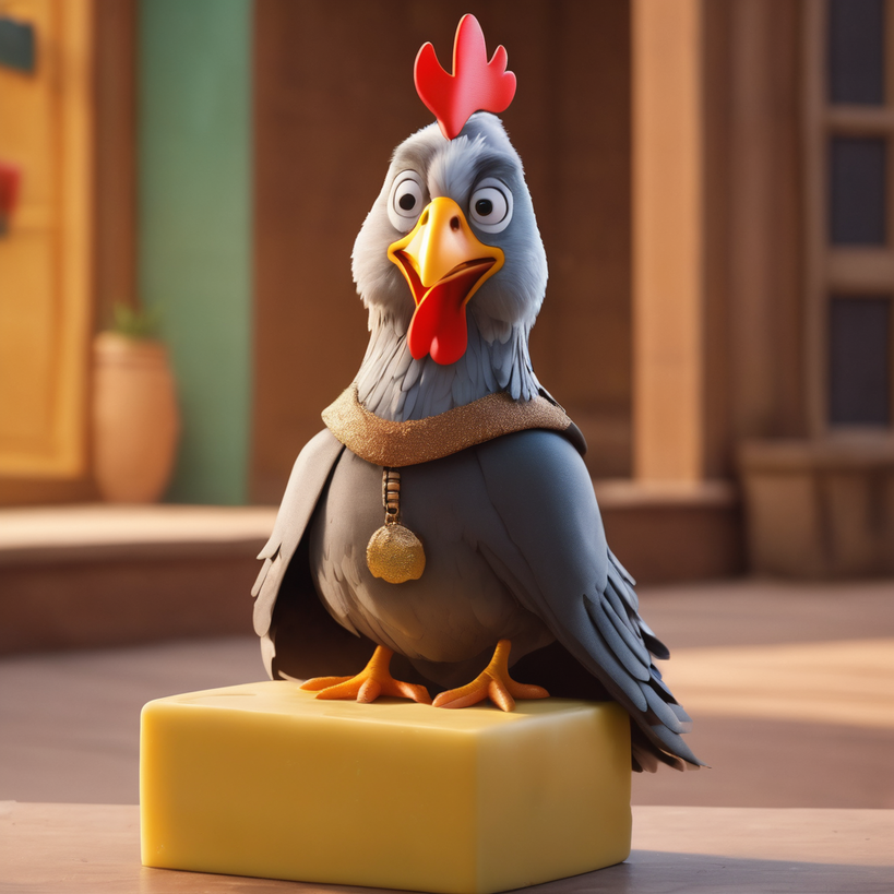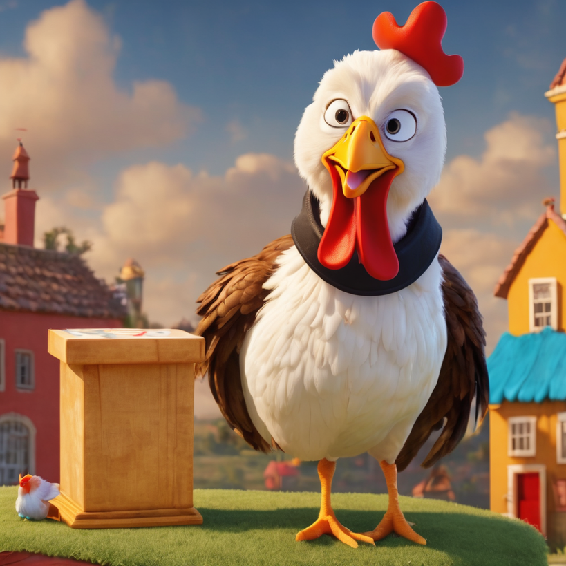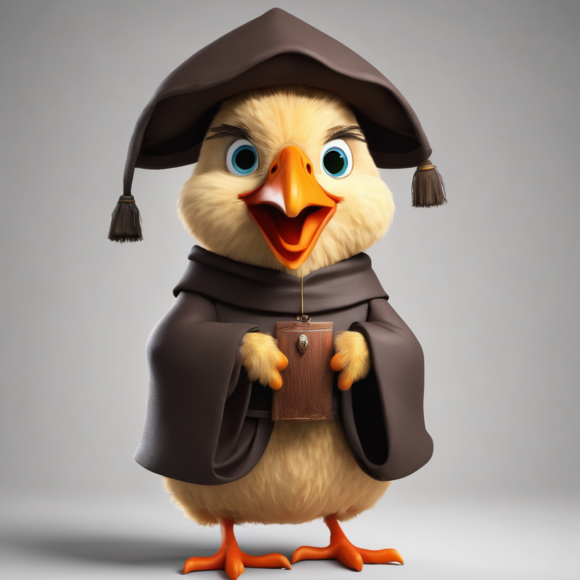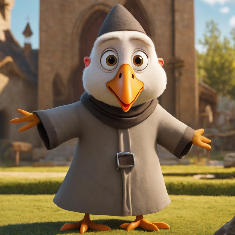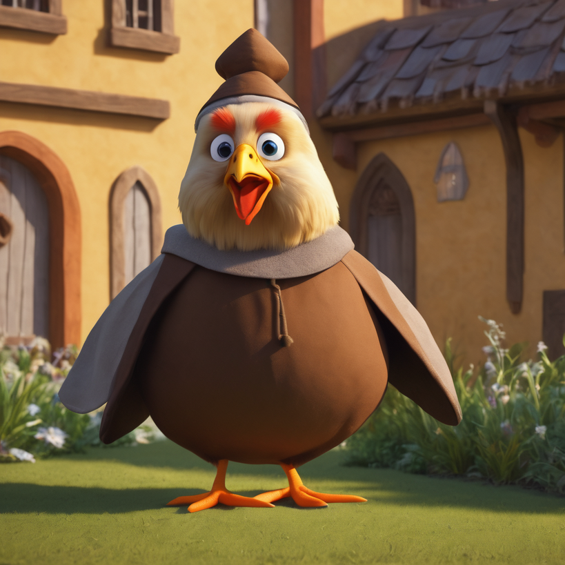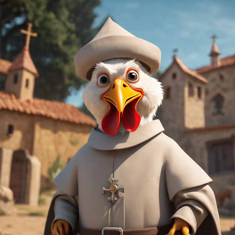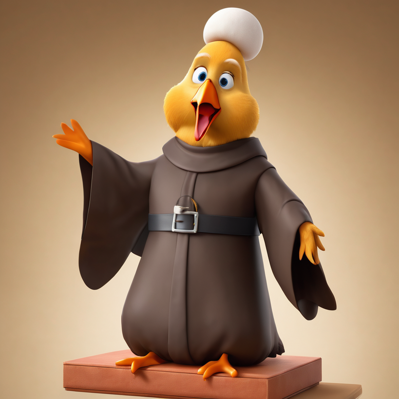 "A bald chicken dressed as a friar standing and preaching on a soapbox"