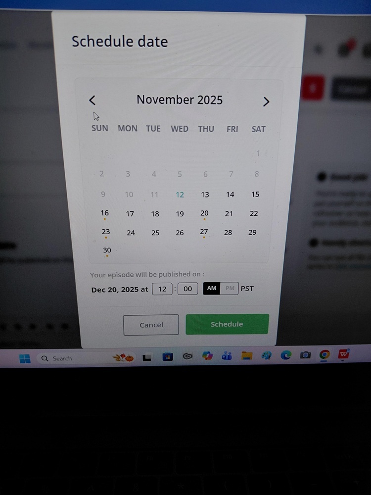 The yellow dot is usually a marker for when other chapters are scheduled to go out, not the current one. Your current chapter on the screenshot is scheduled to go out on the 20th of December (a Saturday) not the 20th of November where the current dot is. It also says 12AM on your screen, not 12PM like you say in this post, so it's going out at midnight, not midday. Likely that means that setting it at 12AM PST means that for you it's going out at 1AM for you, so Thursday morning.