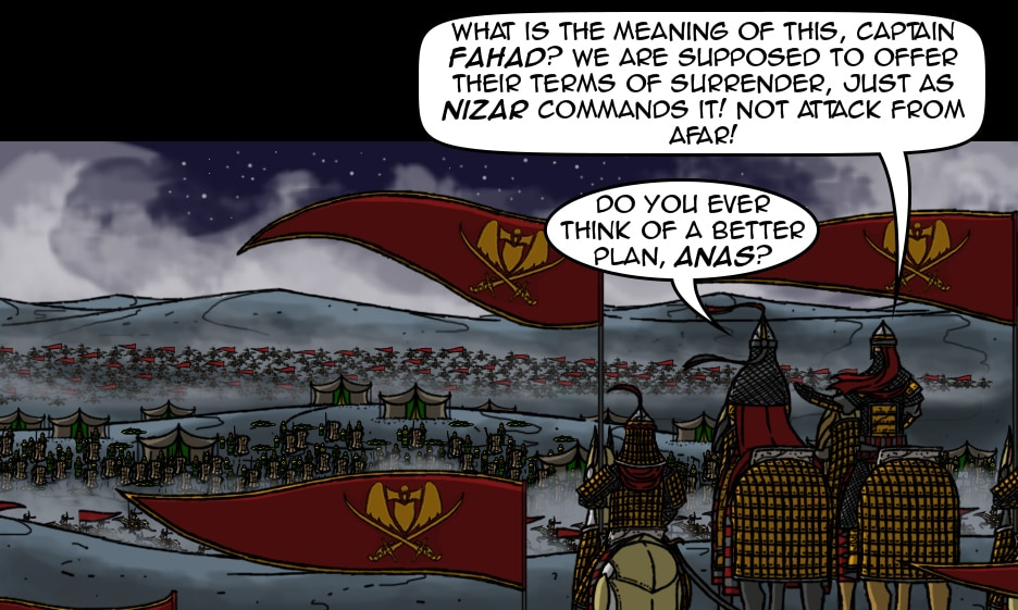 He was task to take down rebel forces but his general named NIZAR gave strict orders to offer their enemy surrender first. If the rebels refuse, then FAHAD is excused to slaughter them to the last man. However, he defied the first rule and went straight to the slaughter despite Lieutenant ANAS'S protests: