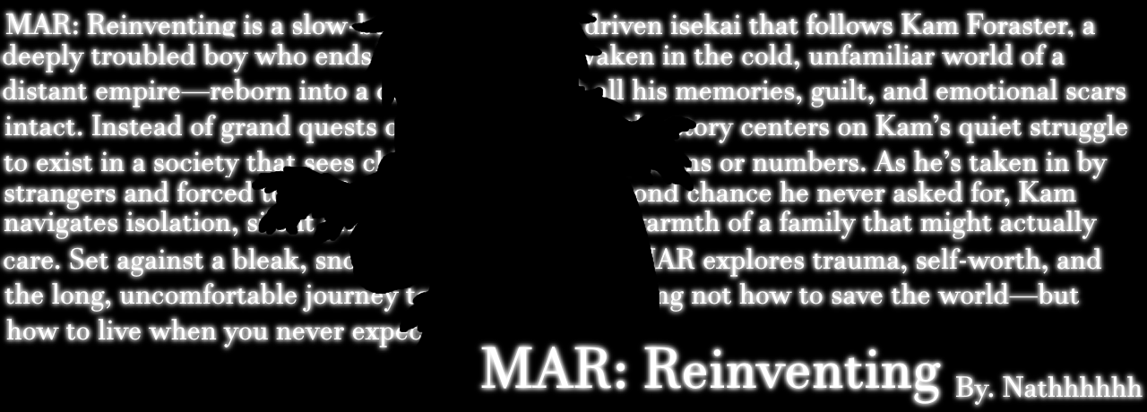 Check out the latest episode in my Isekai Novel, MAR: Reinventing, will be releasing daily for all of Arc 1. Feel free to leave a comment, all honest feedback is appreciated and goes a long way in helping me grow.