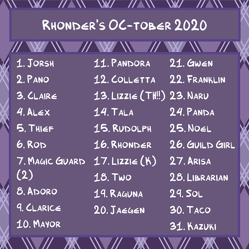 tbh I probably would have still been doing Inktober this year had it not been such a bizarre year and may participate again in the future, but for this year I decided to throw together a custom OC-tober prompt list instead~ I'm low on traditional art supplies and space & busy with other projects... so I'm just gonna take it easy and draw characters that I don't have to think too hard about lol