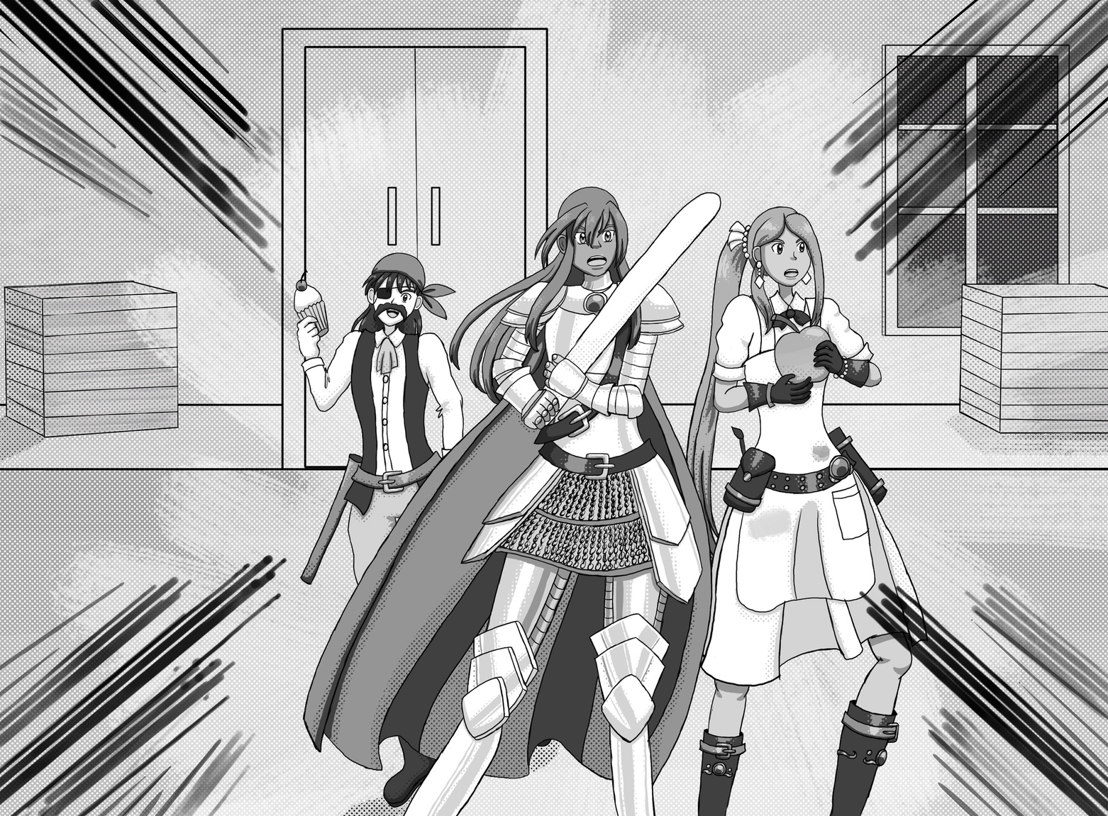 Some characters are trying to defend the mess hall with a food fight because they couldn't use their real weapons!