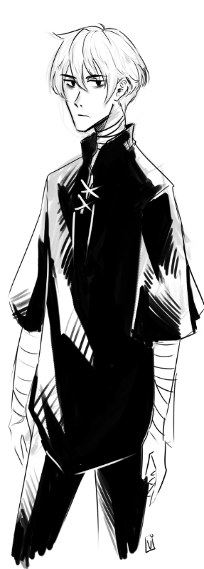 Cassian is a necromancer with the soul of a hermit and the attitude of a mean girl. He would like nothing more than to go home and wait for death, but he's been pulled into a ridiculous quest by the thief who broke into his house. Basically, he hates it here. Cassian has white hair I draw as gray most of the time and black eyes.