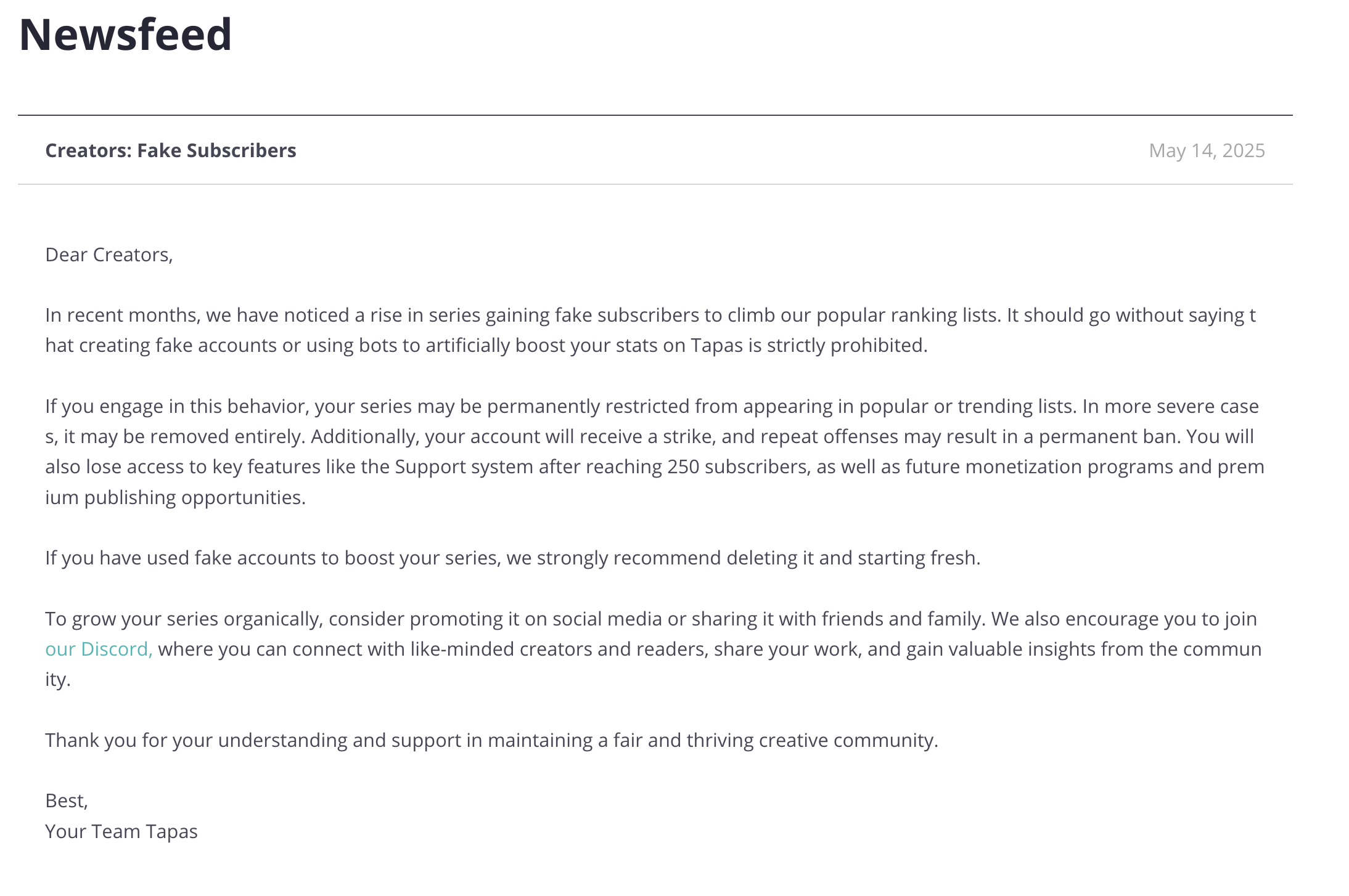 Now, Tapas releases this announcement automatically assuming every creator with a fake subscriber must be responsible for that fake account and will ban that creator. Tapas does nothing about fake accounts of bots and scammers but will punish creators on assumptions when they decide to pay attention.