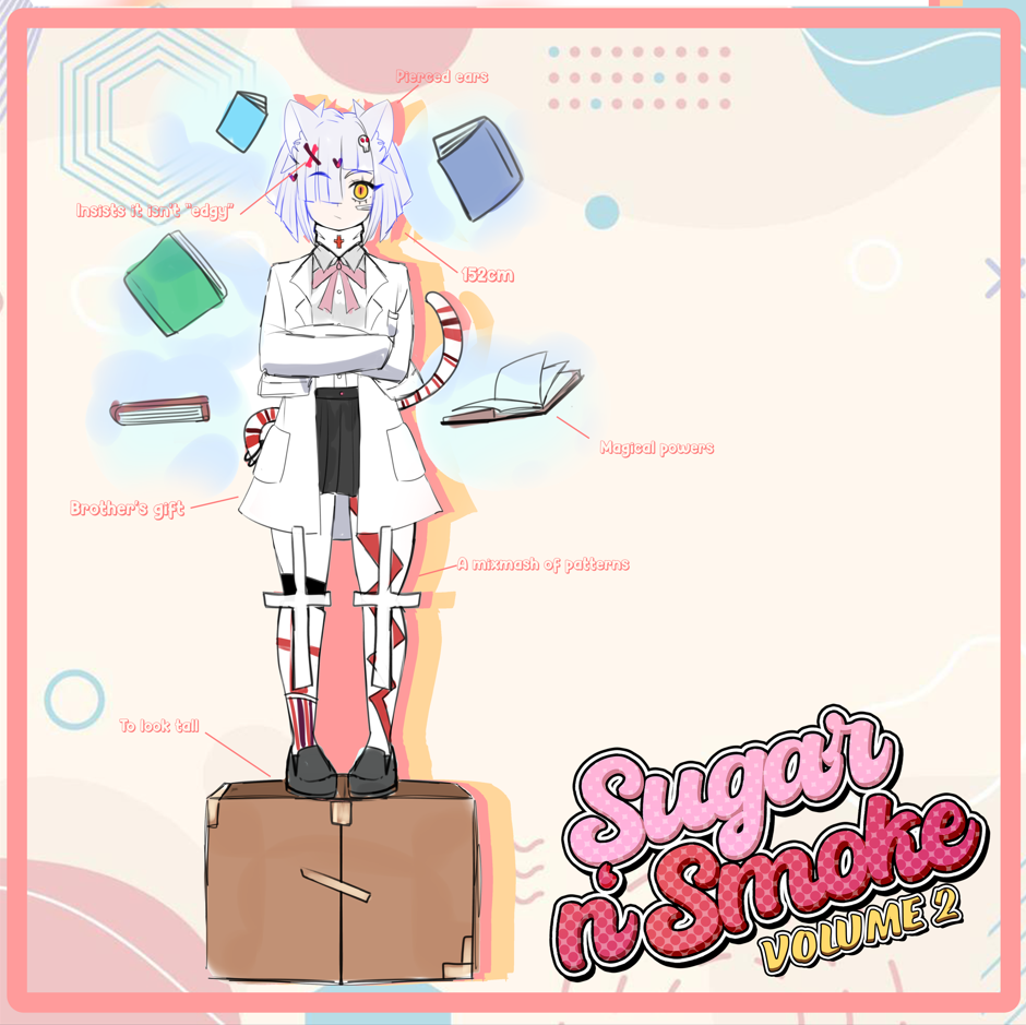 For this character, my favorite detail about her design is the way she is presented. Her design in Sugar and Smoke tells the readers that she is the "Don't care, I do what I want" type of character, it's evident in her messy visual patterns. But despite that, somehow she's also a person who specializes in the field of medicine, a highly skilled one at that.
