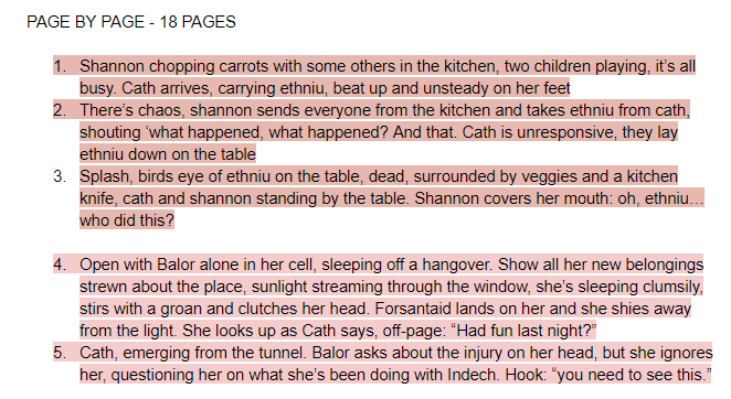 so ive got my events jotted out, then i get those page estimates into something concrete. notice, however, that we're still thinking big picture - dialogue isnt tapped out, neither is panels. just what happens in this page, and sometimes notes on key visuals.