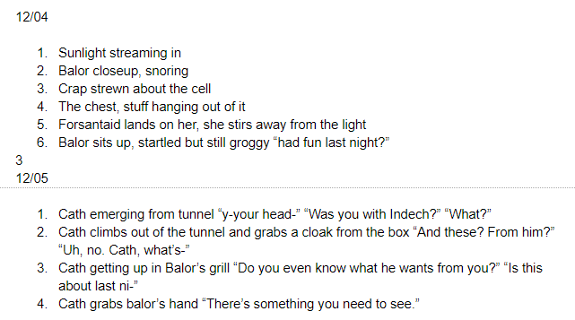 so, i start by just jotting out the events as they occur to sort into scenes, and an estimation of how many pages this will take. this will be based on the pacing of your comic, but my rule is that in every update something must happen, and you must leave the audience with a question (what will happen next, who just came in, what did they notice?) so if youre releasing one page a week, make sure each page has a good hook and moves the story forward. if youre releasing four, you have a little more leeway.