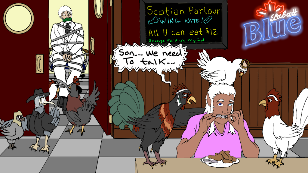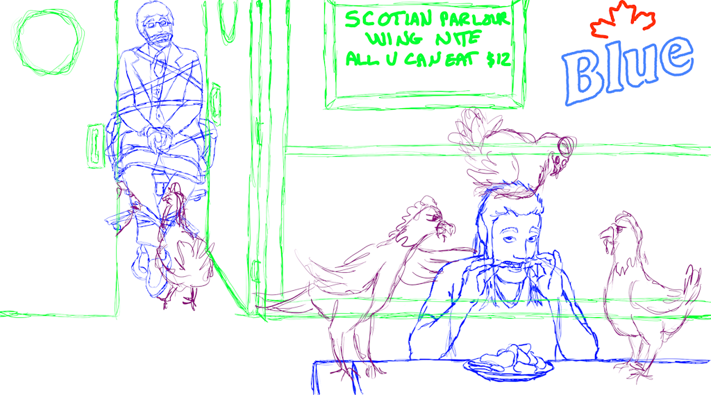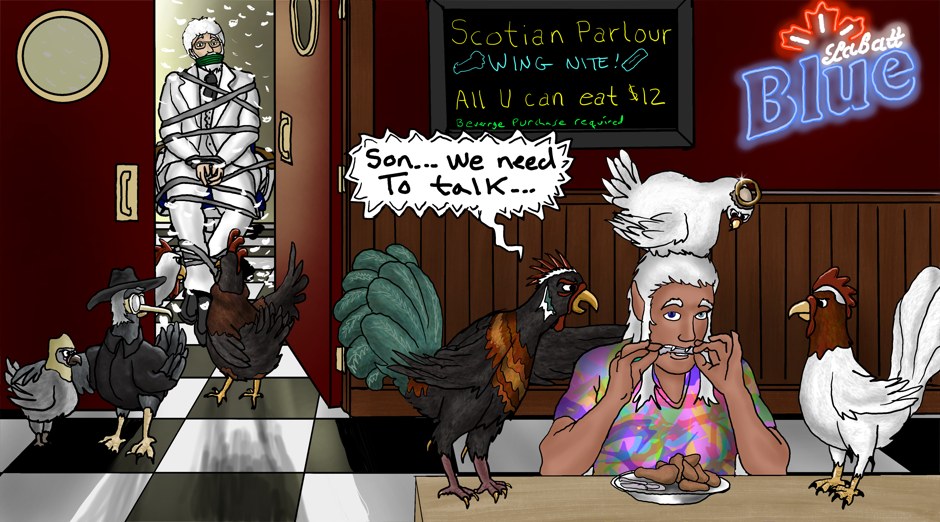 Fun Fact: The Scotian Parlour was a real bar near my childhood home. They were famous for their wing nights: On Tuesdays wings were 10 cents each. I always went full glutton. I don’t drink, so Wing Night was the only thing that would get me into a tavern back then. Daecon inherits his love of wings from me.