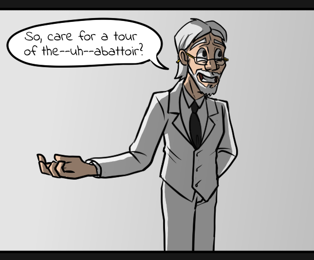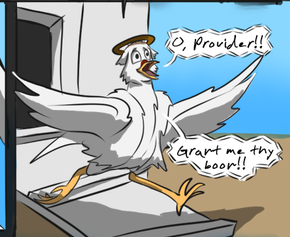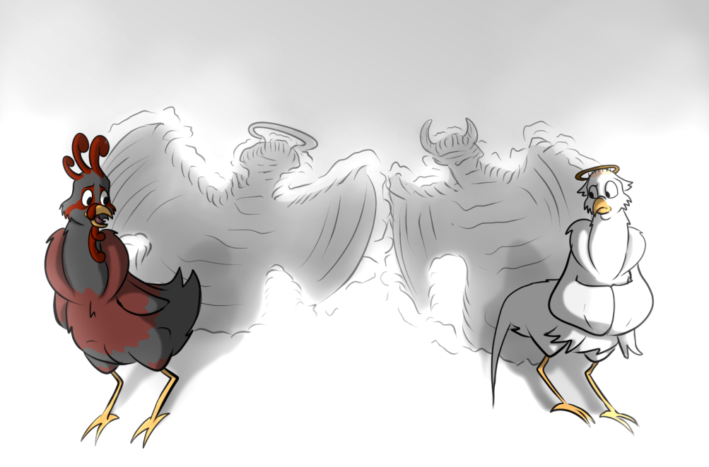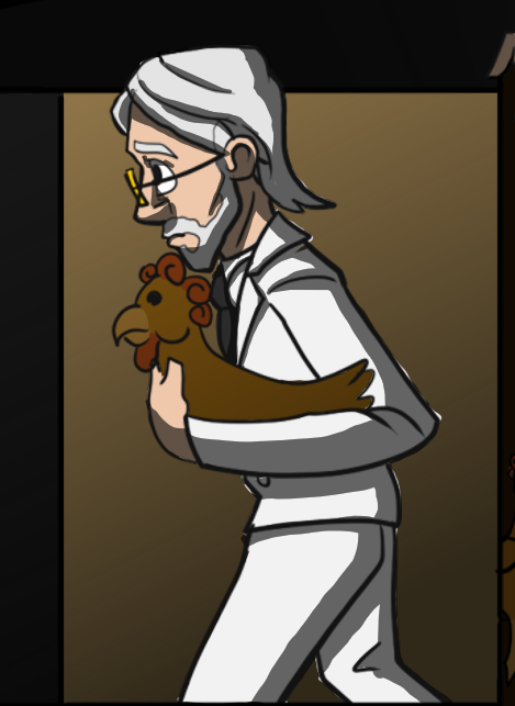 Also, it just occurred to me that it might be funnier if there were a bunch of feathers floating in the air in the kitchen around Alec. I might yet add some.