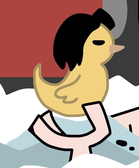 His hair is black and because he's sad all the time, he has a default face. A completely default face. Like, you go out and see this face when their doing dark art and you check out it's drawing... It's just not there. The arts' cruddy, his wings are stuck to his body so he had to get an adult with the same default face to draw for him. The duck called it his, but no one believes it. He's full of pride. Stupid duck. Quacker azz.