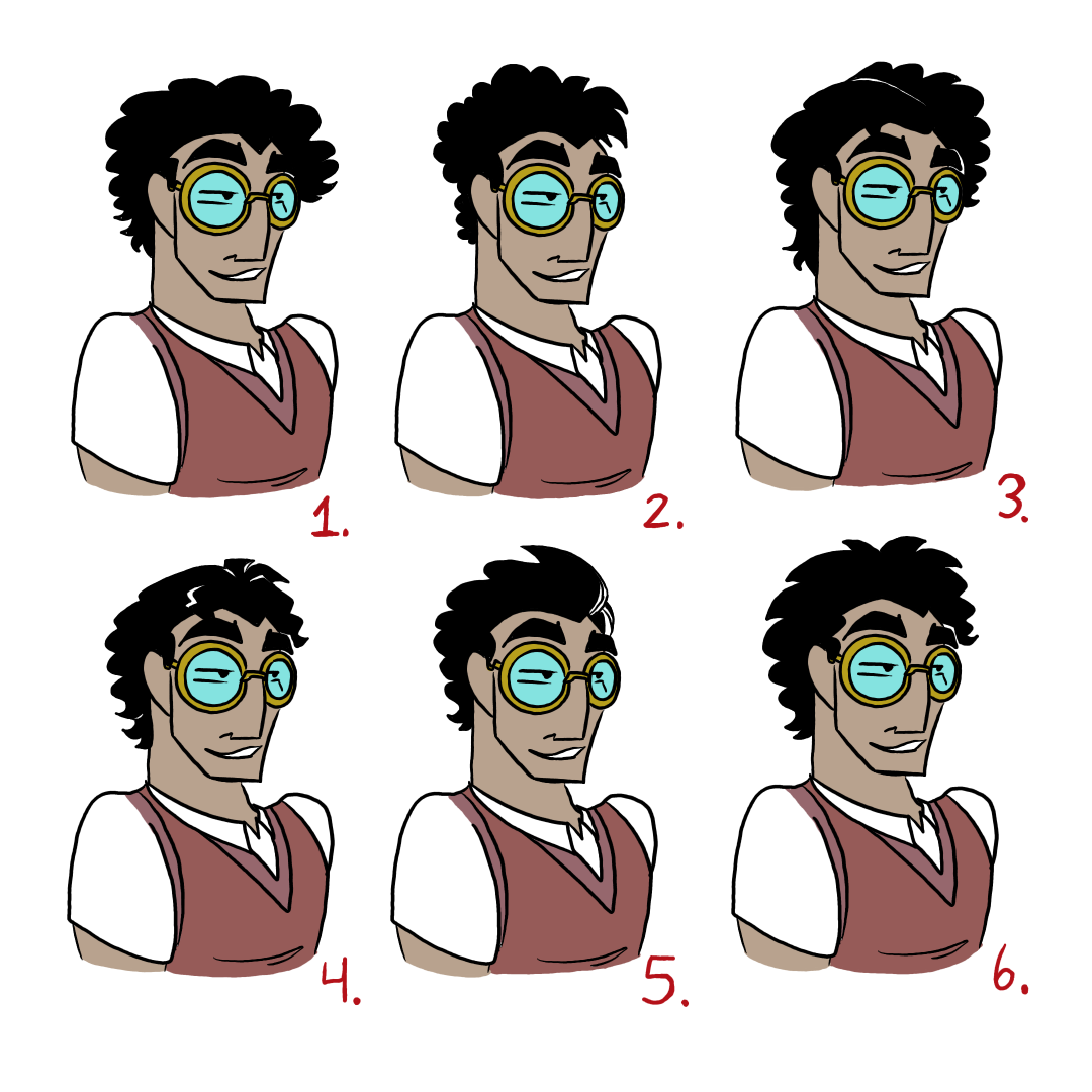 I wanted him to go back to his natural hair at some point, but 1930s hairstyles for men are mainly a ton of the same thing, and there aren't a lot of refs for curlier hair, so I did a bit of research and made some options.