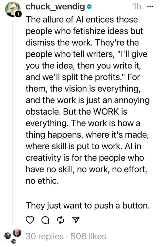 Art is about constant development, personal input/output, and individuality. Even with the inspiration and imitation of styles and techniques over time, we are still the ones moving our bodies and training our eyes to build upon a greater compendium of knowledge that has been growing for over tens of thousands of years. Observation, dedication, and progress are what make an artist. But what also makes us is our love and support for each other. The teachings of masters, the critiques from peers, the curiosity and burning desire in our hearts to strive for refinement and deconstruction. AI is the erasure of community and sociality within artistic projects, and by extension, is the erasure of civility and education. This is why there has been immediate backlash from the art community since day 1 of generative AI imaging being released into the general public's hands. It's saddening. And I feel defeated when I see people still teetering in the center, mainly because the idea of just clicking a button and getting it done is very tempting--especially when you can erase the entire step of interacting with an artist or building a rapport with an artist or having an understanding or appreciation of art and someone's work. Again, it rids you of educating yourself. This "civility" spoken of in this comment section is kind of bizarre to hear. It's been YEARS with generative AI being a mainstream thing. Please understand people's frustrations with this conversation/argument being had over and over again with NOTHING being done about it. The AI companies are still making millions, even with the court cases against them... My work has been scraped without my consent. My work has not been safe on the internet. And yet, how am I, as an artist, supposed to exist online in our modern time? It is more than frustrating at this point... so please understand the harsh criticisms and reactionary responses to your use of AI.