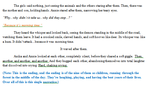 It's really detailed. I write my scripts in novel-form. I mostly summarize a lot of the story plots, kinda like a book report, but I do show explicit dialogue and actions I want to keep, inner character feelings, and little side notes for myself. I also color-code parts to separate between the notes, character thoughts, and dialogue.