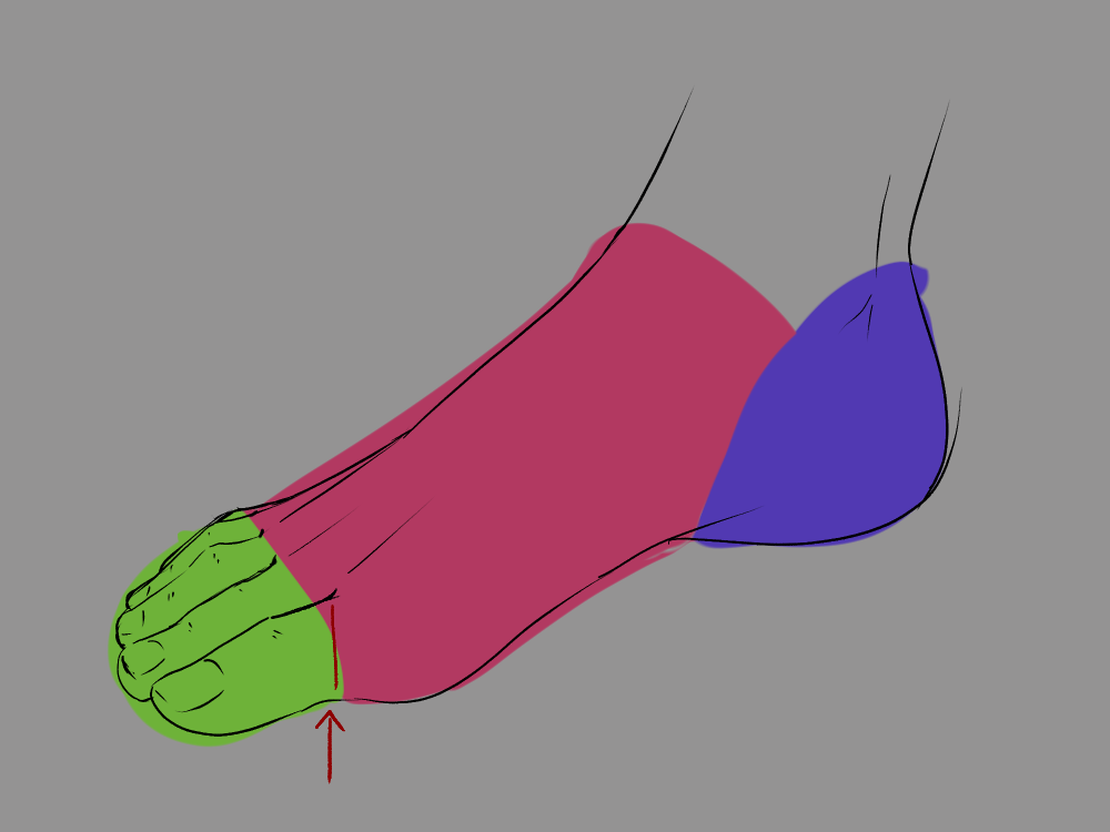 The green section is the toebox. When looking at your model, the big toe starts almost perfectly above the little indent between the toe and the balls of the feet. I drew an arrow to point out what I mean. But, your second post did a good job of lining up the toe.