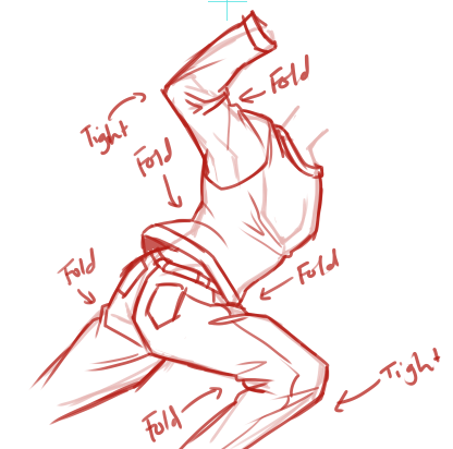 2. Placing wrinkles/folds in the right place and also not over doing it. Your going to find folds where you find joints. Joints at the elbow, the shoulder, the knee, the hip, the ankle, the neck, and not forgetting the spine resulting folds along the torso. Folds don't only occur at joints, but that's the main place you'll find them. Example: