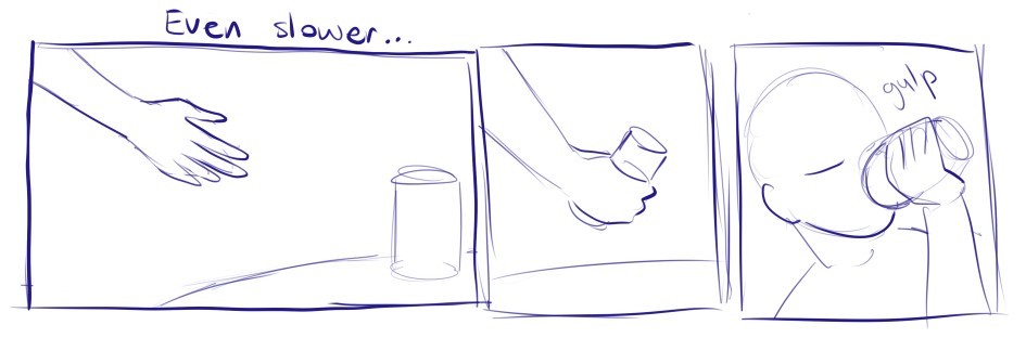 Okay, cool, so that slowed things down, adding almost a hesitation or a sense of buildup to that action, and also pulling in on Bob for the drinking part, like we're really focusing in on that moment and lingering on it, slowed things down.