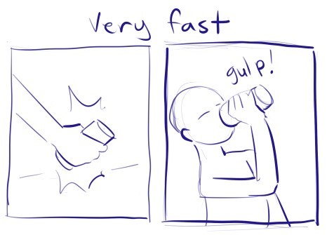 Okay, now let's add in an extra panel where he reaches for it...then grabs it and drinks it.
