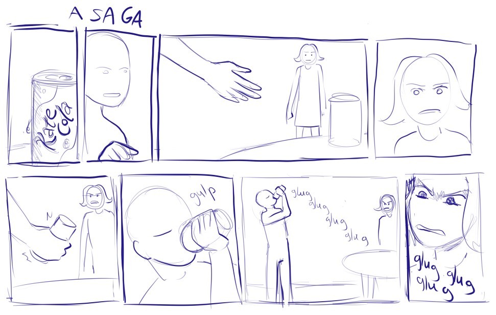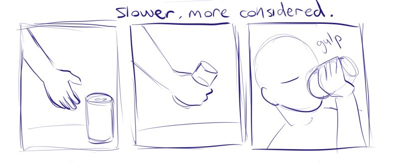 So in this one, we get a shot of the coke can in detail, because detail slows things down. Then we see Bob seeing the delicious cola, creating anticipation. We see him reach for it slowly across a long panel...and there's Alice looking on. We see her anticipation. We see Bob grab the can and Alice is pissed. We pull in on Bob taking a sip, lingering on it, then we pull out for a long, agonising panel where the glugs cross the space, and the glugs continue, drawing out that moment as we pull in on Alice's building anger.