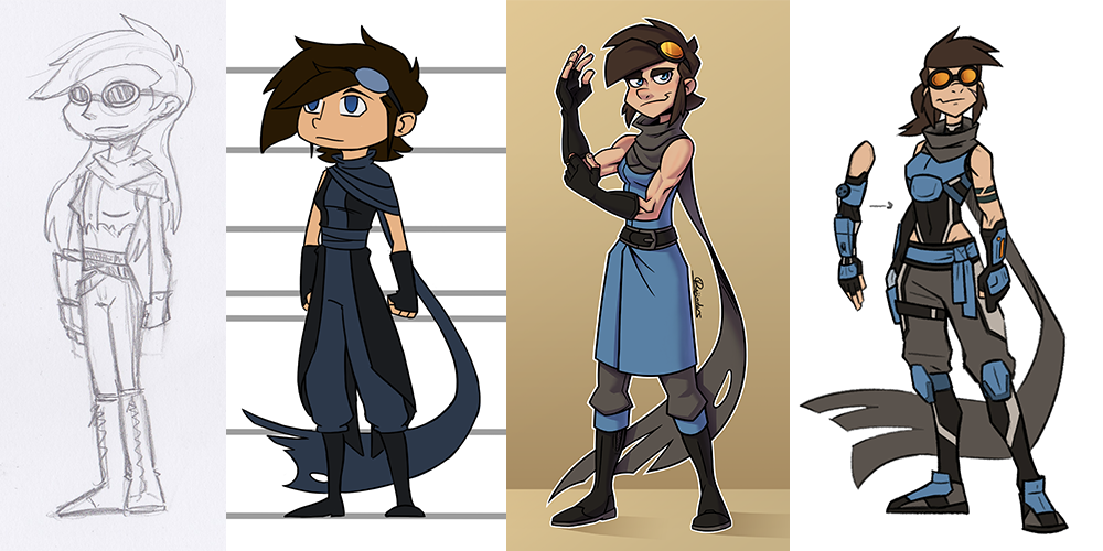 3) Comic book Kyara. Expanding on the world of Trespasser, I decided she needed a partner, a best friend. So, I took the crafting part of her orinigal characterization and molded it into a whole new character (this would eventually become Zack!). In this stage she became the character we know and love today, an impulsive badass who'll always be there for her firends. The Big warmachine from earlier versions also made its return and would transform into Blip.