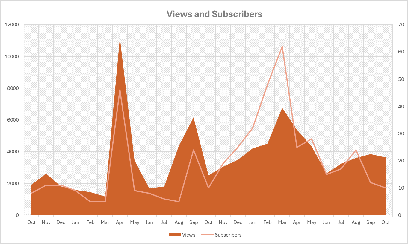 Still, I'm anticipating a relative decline in new subs over the next year. When the issue came up in September, I went through my subscriber list and found that ~1/4 of my total subscribers were sub4subs. I suspect that is also the case (or worse) for others who participated in sub4sub extensively. With the explosion in AI generated content, I was becoming choosier in sub4subs as time went on, others not so much. On the other hand, subscriber decay is much less after I stopped doing sub4sub, so that's good.