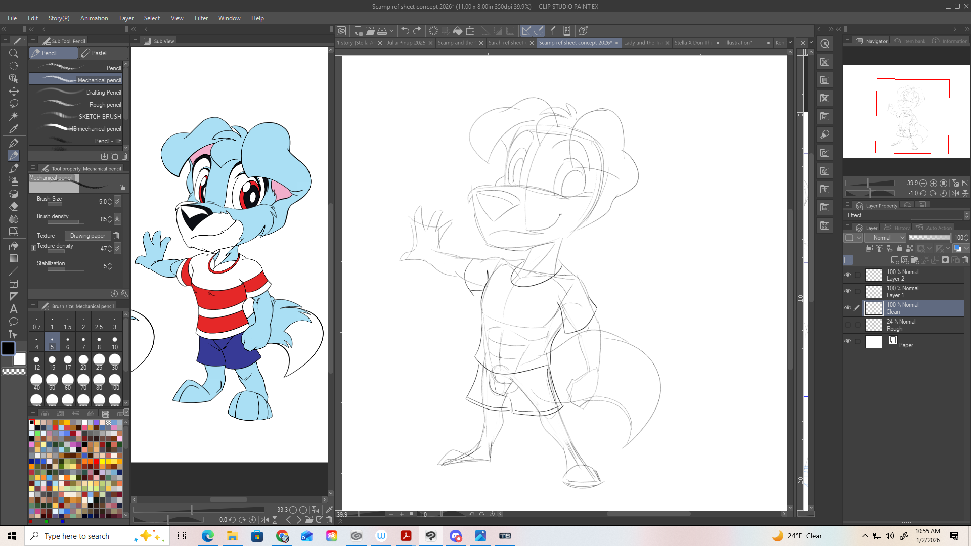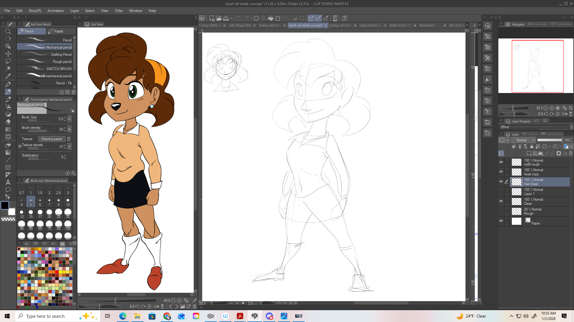 Now I say all of this with the notion that Im remaking turnaround sheets for two characters, who's sheets are also approaching 3 years old. But these are two characters that not only some of the easier characters to draw, but also have sheets that have aged better than ones Ive made in the past; Scamp and Sarah. The reason why their sheets have aged the best is mostly due to the fact that they include a a full body front, side profile, and back view. In the past, Id do the front, and either the side or back view, so the fact those two had full body drawings of all three made their sheets future proof. Also, these are characters that Ive drawn so much that I don't really need to refer to their sheets as often. Although, the issue I have noticed with these two sheets as time has gone on, especially after my artistic growth earlier this year is the amount of straight lines in the posing, and the lack of clear defined shape language and silhouette. And in regards to how Ive drawn Scamp and Sarah recently, its not entirely different but there are design discrepancies that are not apparent in their 2023 sheets. And in regards to Sarah specifically, I did want to simplify and tone down her hair a little bit. But even still, if that warrants new sheets for them. (Below are comparisons. The image in the ref window are their existing 2023 sheets and the right is their new revamped designs)