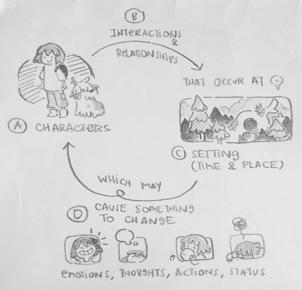 (D) You could check your local library and see if any book for making comics (story) might help you. If you would like to read a particular book that is not available at your local library, check if they may borrow the book from another library for you to request. I wandered in my local library and found "How to Be A Manga Artist" by Balthazar Pagani and Asuka Ozumi; and took notes I found helpful for me -- shared below.