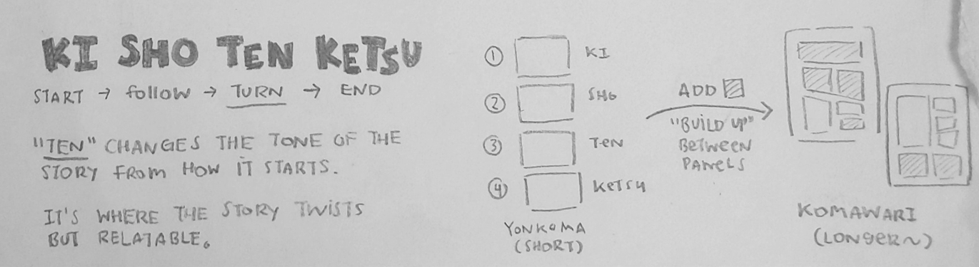 Yonkoma - Tell short story in 4 comic panels. Uses the kishoutenketsu story structure. Can make it bigger by adding more "build up" inbetween panels.