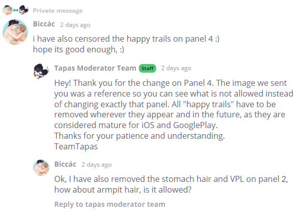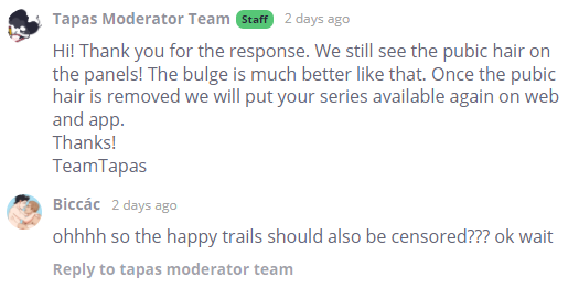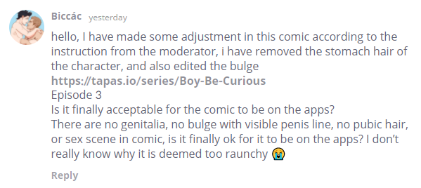 So, my comic was removed from the apps because of a bulge and "pubes?", so the moderator contacted me, and they were very nice, so i edited the bulge to make it less graphic, and they say oh ok good, now you need to erase the pubic hair