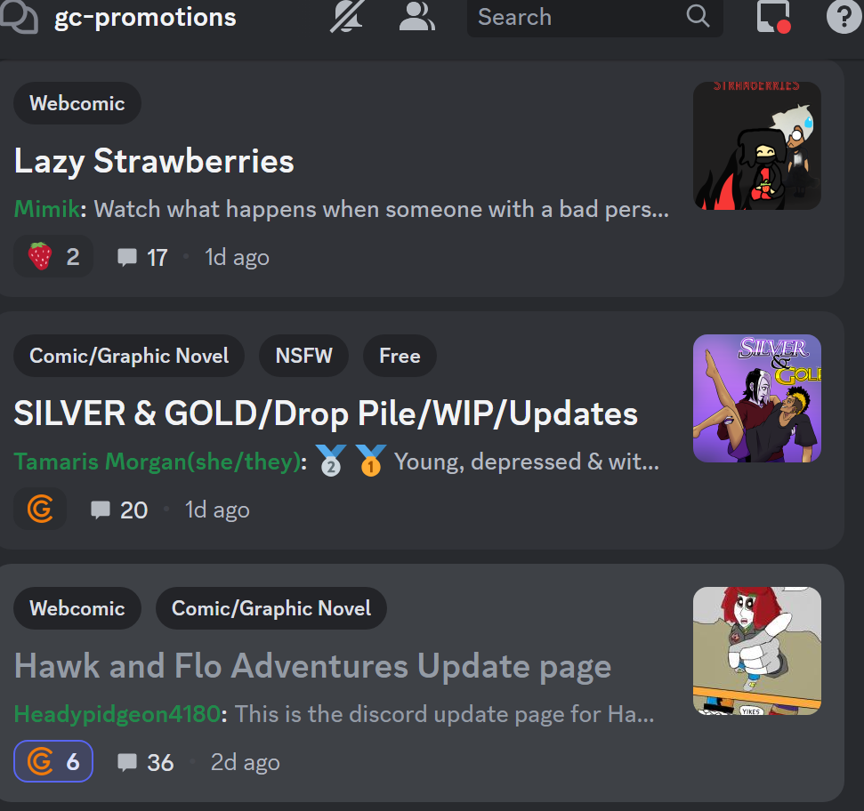 I've had a very nice time with Globalcomix over Twitter, I grew up as a comic collector so I have common ground with the current admins. Unlike Webtoons or Tapas which have their own separate social media teams The Globalcomix Twitter account is run by the Admins and they each handle the official twitter account in shifts. They also have a very good Discord which gives you your own separate section for your comic as opposed to the usual promotions section. In your section you can share WIPs and announce updates as you can see Multiple comics have their own sections ^^.