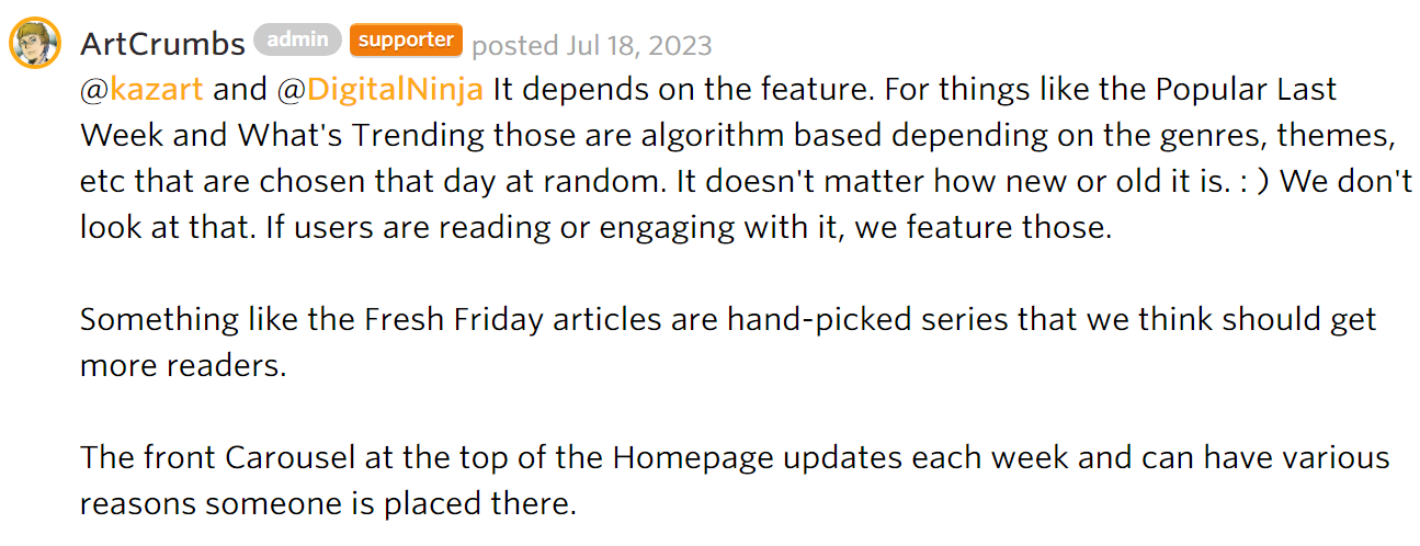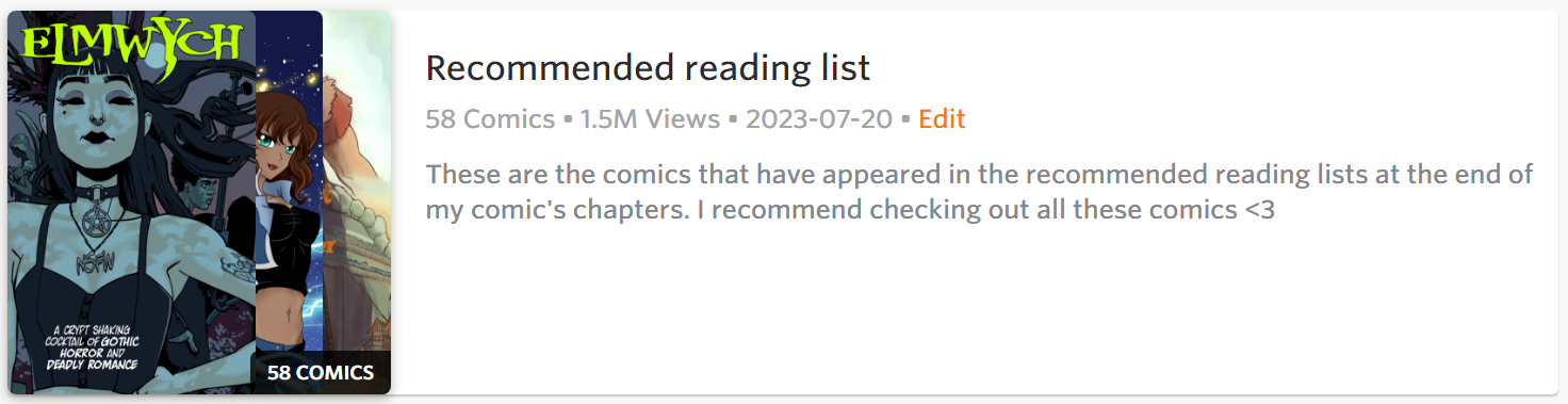 My comic runs it's own 'Pseodo' featured section called the recommended reading list. Where I promote other people's comics at the end of my comic's chapter. Promote the comics on social media and on Globalcomix I can add your comic to the public list as seen above ^. So if you have been considering trying the site, feel free to contact me. i'll give your comic a read and i'll consider (and most likely) add your comic to the recommended reading list and hopefully get you off on the right foot on the site. I know I'm not able to bring you 1000s of followers instantly but I'll do my best. I am one of the mutuals with Globalcomix on Twitter and they have pinned the recommended reading list to their Twitter profile in the past. Which was a massive help for everyone involved.