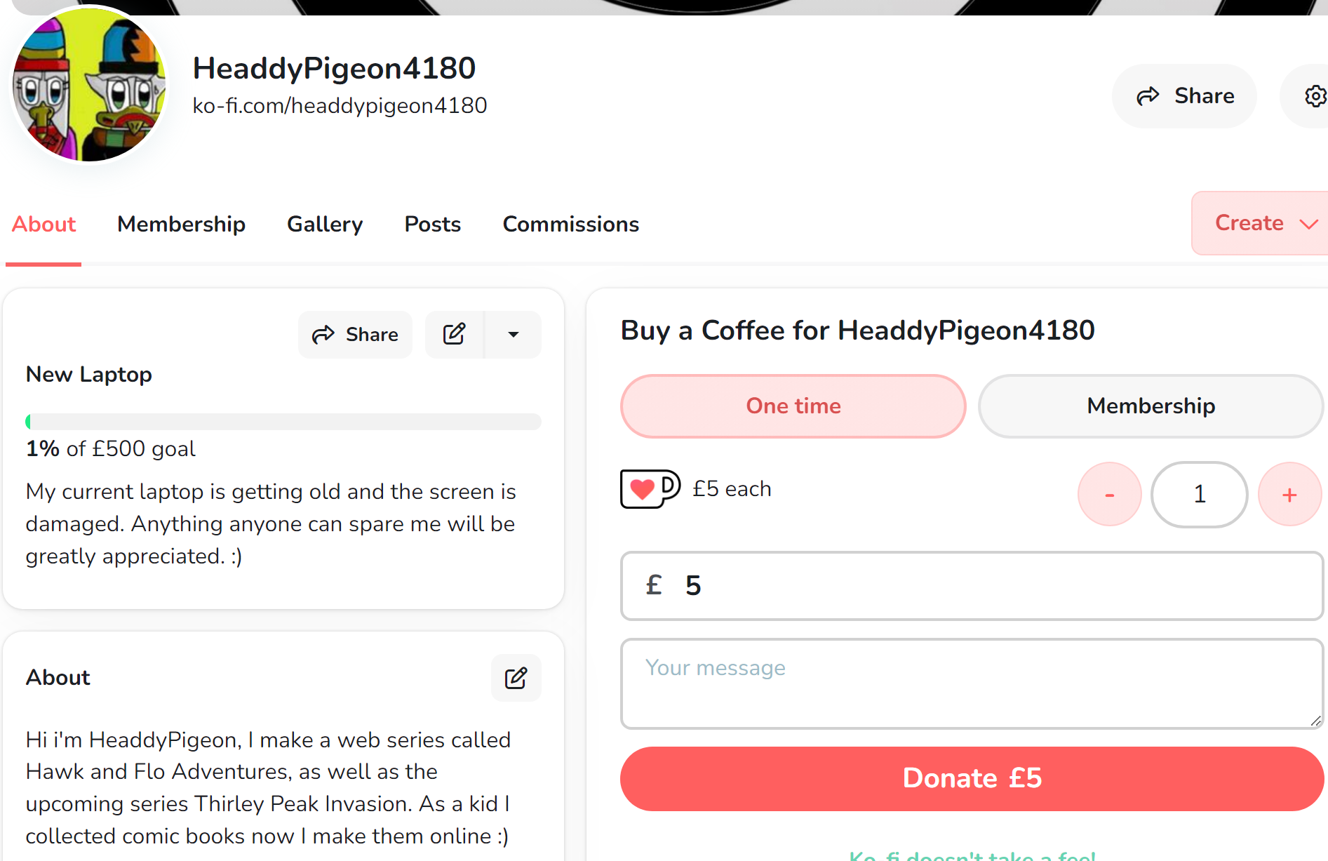 Ko-Fi is similar to Patreon, unlike Patreon Ko-Fi Allows you to make one off donations and doesn't charge a fee. The bad news is if you want anybody to tip you less than £5 or more you have to pay for a membership program >.<. The site is pretty easy to use, so far i've had one donation in the time i've been on there. You can only upload so many images into one gallery though, similar to Comic Fury and Tumblr. There is a membership option on Ko-Fi similar to Patreon so if you have memberships on one site it's very easy to transplant them over when you get chance. Ko-Fi's pretty good overall though growing it from scratch is hard but well... so is growing any site from scratch. ^^