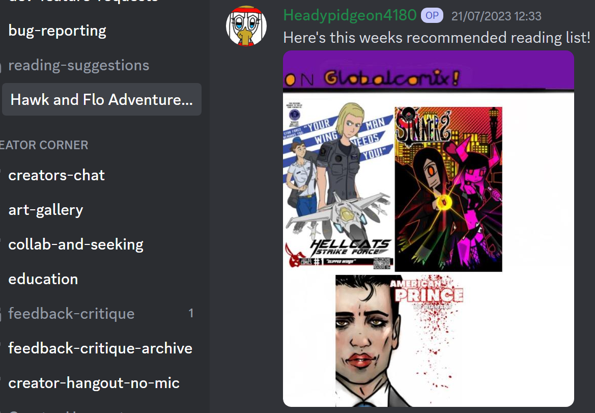 Yep, The recommended reading list has it's own section in the official discord. Yay! I will be mirroring this thread into multiple places so I won't be leaving any direct discord links in this thread but it is pretty easy to find. If you have any questions about the site itself you can go into the creator chat and ask the site owners/ moderators yourself. They're very friendly people and I have so far had nothing but wonderful interactions with them and the Globalcomix community ^^.