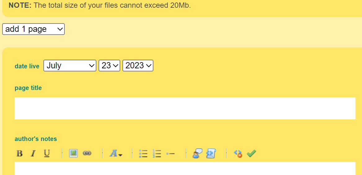So An average Webtoon/Tapas chapter can be put on The Duck no problem. There's only one thing you have to do. Copy and paste all of your chapter files onto one long file. It's what my friend @sefra114 did with their series 'Bagley The Ok Magician'. Which is how I found out myself. Thanks Sefra! That being said the site is slow paced and easy going so 2-3 panel 1 page a day is fine It's what I do ^^.